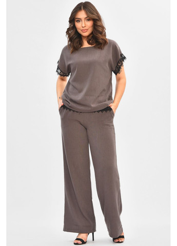 - Брючні костюми з льону — найпопулярніший варіант. Це можуть бути прямі або широкі штани в парі з тунікою, жилетом чи сорочкою.