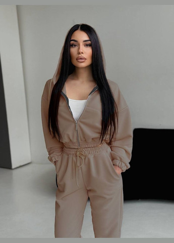Бежево спортивний костюм із теплого флісу з вільним кроєм. Толстовка крою кажан на блискавці з коміром стійкою та кишенями. Модель з манжетами та довгими рукавами. Штани широкого крою оснащені кишенями. Напівобхват: Кофта: Груди: S (60), M (62), L (64), XL (66), XXL (69), 3XL (72), Довжина виробу 60, Рукав 54, Штани: Талія: S (32 40), M (34 42), L (36 44), XL (38 46), XXL (40 48), 3XL (42 50), Стегна: S (51), M (53), L (55), XL (57), XXL (59), 3XL(61), Довжина виробу 106, Довжина по внутрішньому шву 76, Тканина: Середньої еластичності.