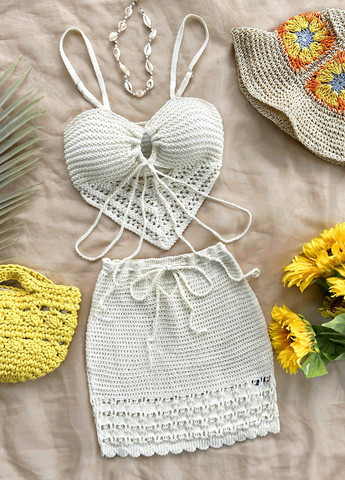 Комплект - топ+шорти. Топ - коротка майка, круглий виріз горловини, без рукавів. На розмір S ПОГ – 40 см, довжина по спинці – 34 см. Шорти – пояс на гумці, без кишень, напівобхват поясу – 33 см, довжина шорт по боковому шву – 30 см.