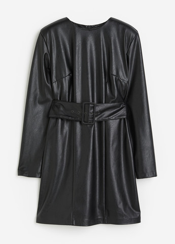 Коротка приталена сукня зі штучної шкіри. Круглий виріз горловини, потайна блискавка ззаду, асиметричний шов спереду та відрізна талія. Рукави-ліхтарики довжиною до ліктя з вузькими манжетами. Без підкладки.