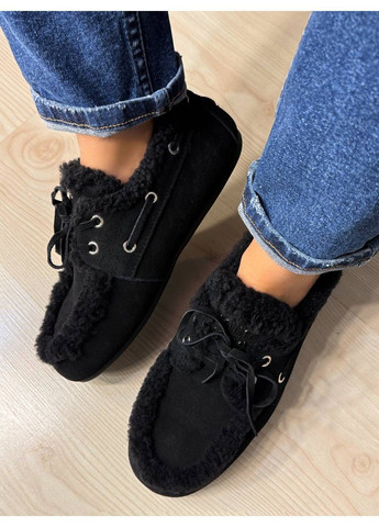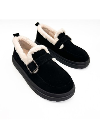 Зимові мокасини чорного кольору поєднують універсальність та комфорт, роблячи їх ідеальним вибором для холодного сезону. Натуральна замша підкреслює витончений вигляд моделі та забезпечує довговічність навіть при щоденному носінні.