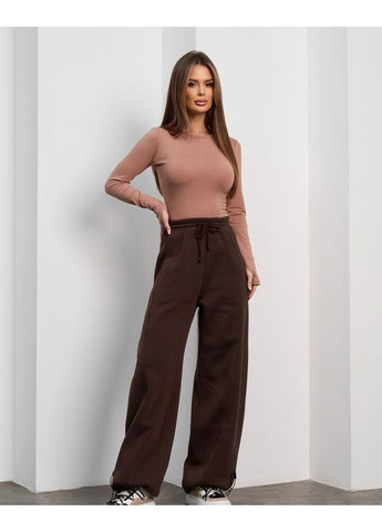 Коричневі спортивні штани прямого крою з тасьмами, виготовлені з трикотажу на флісі. Модель на поясній гумці з кишенями та високою посадкою. Напівобхват: Талія: S (32-38), M (34-40), L (36-42), XL (38-44), Стегна: S (47), M (49), L (51), XL (53), Довжина виробу - 110, Довжина внутрішнього шва - 80, Тканина: Середньої еластичності.