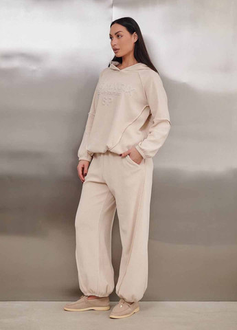 Костюм виготовлений з мікровельвету, який має дрібну фактуру в рубчик. Тканина має мінімальну розтяжність, враховуйте це під час підбору розміру. Завдяки своєму оверсайз фасону гарно сідає по фігурі. Кофта з довгими рукавами на манжетах та капюшоном. Плечовий шов спущений, що створює вільний силует. Кофта застібається по всій довжині на блискавку, має дві прорізні кишені по боках та гумку по нижній частині. Штани-джогери з високою посадкою, талія на гумці без застібок. По боках присутні дві кишені з відрізним бочком.