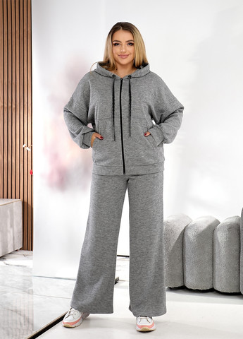 Костюм виготовлений з костюмного італійського трикотажу, дуже приємна тканина на дотик. Має невелику еластичність. Завдяки своєму фасону, гарно сідає по фігурі. Бомбер оверсайз крою з довгими рукавами на манжетах, застібається на блискавку. Має спущену лінію плеча та комір стійку. Штани з високою посадкою та гумкою на талії, мають дві бічні кишені з відрізним бочом.
