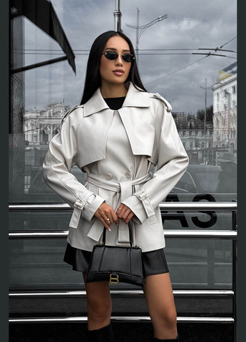 Для тренчу вибрали гладку та м'яку екошкіру. Тренч на підкладі, застібається на об'ємні ґудзики. Модель доповнена оригінальними декоративними елементами – відлітні кокетки по переду і спинці, погони на плечах.