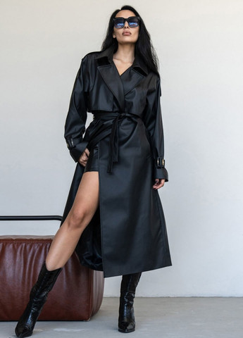 Тренч з еко-шкіри чорного кольору. Фасон оверсайз. Рукав реглан. Довжина 118см. Застібки немає, в комплекті є пояс.