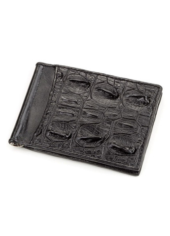 Матеріал: натуральна шкіра крокодила; Розміри (ШхВ, см): 12х 8,5; Колір: чорний; Країна виробник: Таїланд. Опис: - металевий затискач для купюр; - дві приховані кишені; - 6 слотів для кредитних карток; - дві кишені з зовнішньої сторони; - внутрішнє оздоблення: поєднання гладкої шкіри і міцного текстилю. Цікавий затискач, з натуральної шкіри крокодила, який пошитий з фактурної хвостової частини шкіри. Аксесуар обшитий гладкою шкірою під колір портмоне. Вироби зі шкіри крокодила завжди вважалися великою розкішшю, так як в світі не так вже й багато компаній, які займаються виробленням такої шкіри, оскільки цей процес дійсно надзвичайно трудомісткий. Кожен виріб з цього матеріалу володіє своєю незвичайною структурою і неповторним візерунком.
