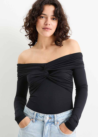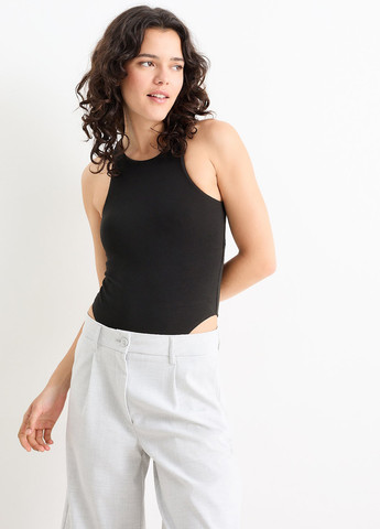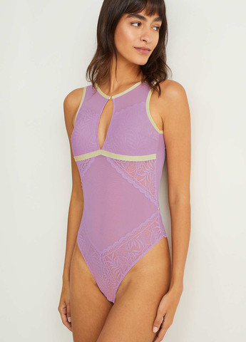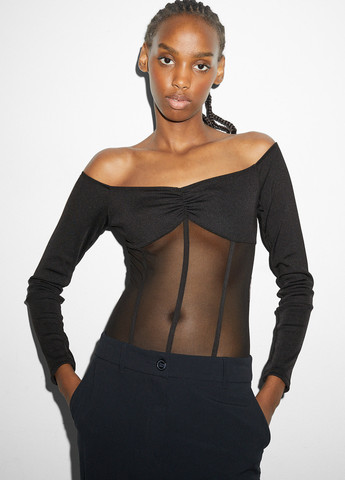 Боді з легкої еластичної сітки з напівпрозорими частинами та квітковим візерунком. Бічні складки, зібрані низи та глибокий виріз горловини ззаду. Застібки на кнопках у промежині та на трикотажній підкладці. Довжина по спинці приблизно 63 см у розмірі S