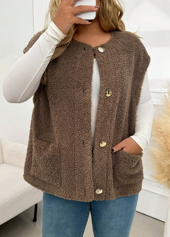 Жилет без рукавів з м'якого плюшу. Дизайн коміра-стійки з плетеною планкою на ґудзиках, потайними кнопками. Обшивка та широкі пройми. Одягнена резинка в основі.