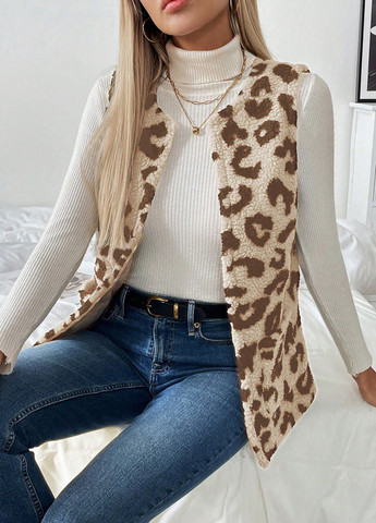 Жіночий повсякденний жилет з леопардовим принтом та підкладкою, зі штучного хутра від SHEIN EssnceЕ. Стандартний крій та круглий виріз. Тканина не тягнеться.