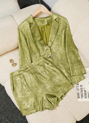 Костюм унісекс вільного крою Manfinity - комплект з 2 предметів. Цей костюм виконаний із жовтої тканини. Він складається з блейзера з довгими рукавами та довгих шортів у тон. Костюм має вільний крій та застібку на гудзики спереду. Тканина трохи тягнеться. Підходить для весни, літа та пізньої осені (10-17 ° C/50-63 ° F). Машинне прання або професійне хімчистка.