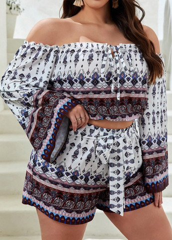 Жіночий набір з топа з яскравим візерунком і шорт в тон. Круглий виріз, стандартний крій та еластична тканина. Підходить для повсякденного носіння або як костюм.