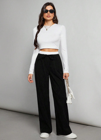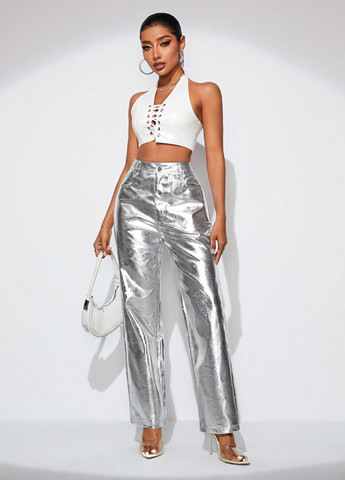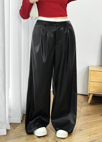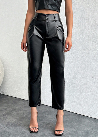 Чорні прямі штани зі штучної шкіри звичайного крою з природною лінією талії та злегка еластичною тканиною. Штани мають повсякденний стиль, велику довжину та містять такі деталі, як гудзики, кишені, блискавка та однотонний малюнок. Вони підходять для весняно-осіннього сезону.