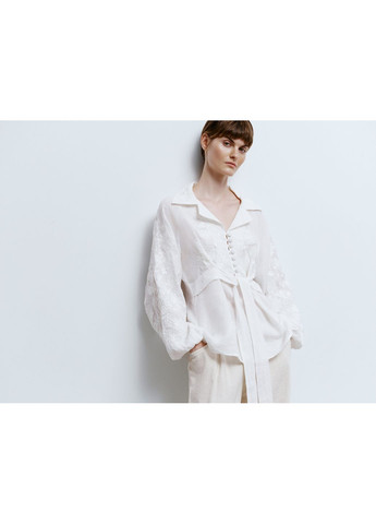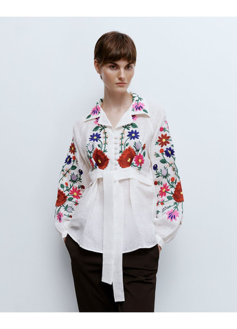 Лляна блуза вільного крою на гудзиках, стилізована вшивним кептариком , оздоблена вишивкою, натхненною мотивами яворівської хустки