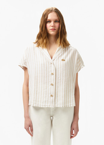 Стильна сорочка Lacoste з полосатим дизайном виділяється елегантним і комфортним кроєм. Дизайн з коміром і коротким рукавом ідеально підходить для теплих днів. Легкий і дихаючий матеріал забезпечує комфорт протягом усього дня, а легкий еластичний пояс додає рухливості в образ. Іконічний крокодил на грудях додає моделі елегантної деталі. Це ідеальний вибір для повсякденних і casual образів.