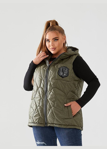 Дизайн: Стильна стьобана жилетка безрукавка для великих розмірів з рукавами до локтя, глибоким капюшоном та практичними кишенями.