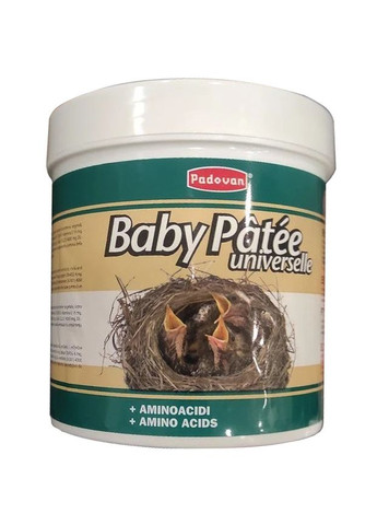 Padovan Baby Patte Parrots – повнораційний корм для пташенят папуг. Суміш для вигодовування пташенят папуг у перші тижні життя до переходу на дорослий корм. Склад: злаки, молоко та молочні продукти, екстракти рослинних білків, хлібобулочні вироби, цукру, рослинні олії та жири, мінерали. Добавки на 1 кг: Харчові добавки: вітамін A 38000 MO, вітамін D3 1100 MO, вітамін E 15 мг, мідь (3b405) 4 мг, залізо (3b103) 38 мг, цинк (3b603) 30 мг, йод (3b30 (3c322) 4000 мг, DL-метіонін (3c301) 4000 мг. Антиоксиданти. Інструкція з годівлі: додайте теплу воду (приблизно 45 ° C) до суміші в пропорції приблизно два до одного. Перемішайте до формування однорідної кремоподібної консистенції і покладіть суміш до дзьоба пташеня за допомогою спеціального шприца або палички. Новонароджені пташенята, які в перші дні життя потребують більш рідкого корму, тому поступово доводьте консистенцію до зазначеного співвідношення, протягом тижня.