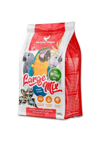 У пшениці багато білків, вітамінів групи В, клітковини, мінералів, її вживання заряджає папуга енергією. Рис легко засвоюється, а жовта та коричнева кукурудза збагачує вітамінами А, В та Е. Гречка містить антиоксиданти, білки, мінерали, клітковину та дуже корисна птахам. Голозерний овес – джерело амінокислот, вітамінів, мінералів, клітковини, покращує роботу органів травлення. Кероб надає загальнозміцнюючий вплив на організм пернатого друга, а сафлор, завдяки ненасиченим жирним кислотам, що містяться в ньому, зміцнює серце і оздоровлює пір'я. Також до складу корму входять: гарбуз (вітамінізує, насичує мінералами та антиоксидантами), морква (містить бета-каротин корисний для зору та оперення папуги), банан (заряджає енергією), перець чилі (джерело капсаїцину і вітаміну С, стимулює апетит), соняшник корисні жирні кислоти, вітаміни, мінерали, антиоксиданти. Кольоровий бісквіт заманює птаха у годівницю, стимулює апетит, розважає під час поїдання зернової суміші. Ксантофіли, що містяться в екстракті чорнобривців підтримують яскравість і насиченість кольору пір'я вашого великого пернатого друга. Особливості та переваги: смачний та корисний збалансований раціон; підходить для великих папуг: жако, ара, амазонів та інших; зміцнює імунітет вихованця; сприяє правильному травленню; насичує вітамінами та мінералами; гарна якість за доступною ціною; підтримує правильний процес травлення; повністю натуральний склад; не містить штучних консервантів та ароматизаторів. Склад: олійне насіння, овес, злакові, кукурудза, арахіс, фрукти, овочі, рис соняшникового насіння, кольоровий бісквіт. Аналітичні складові: сирий протеїн 17%, сирий жир 25%, сира клітковина 10%, волога трохи більше 15%. Рекомендації щодо застосування: міняйте воду та корм у потрібний час. Насипте корм у годівницю і дайте птиці поїсти стільки, скільки вона хоче. Обов'язково простежте, щоб пернатий щодня мав свіжу і чисту воду у вільному доступі. Умови зберігання: зберігайте корм у сухому та чистому приміщенні. Відкритий пакет корму зберігати у прохолодному сухому місці. Фасування: 600 г