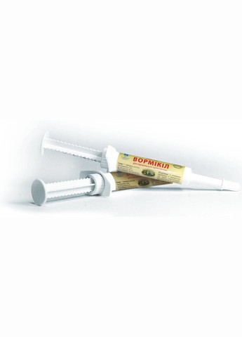 Склад: 1 г пасти містить речовини, що діють: фенбендазол - 0,05 г; празиквантел – 0,005 г. Діюча речовина - фенбендазол (група бензімідазолів) гальмує полімеризацію білків тубуліна в мікротубулінах, знижує активність енергетичних ферментів, уповільнює метаболізм у гельмінтів, в результаті чого порушується засвоєння поживних речовин (аденозинтрифосфорної кислоти та глюкози). Фенбендазол практично нетоксичний для тварин, ембріотоксичної та тератогенної властивостей не встановлено. Фенбендазол має овоцидну дію. Ефективний проти шлунково-кишкових і легеневих нематод, у збільшеній дозі - проти трематод і цестод тварин. Празиквантел підвищує проникність мембран для іонів кальцію, викликає підвищення м'язової активності, яке змінюється скороченням мускулатури та спастичним паралічем, спричиняє руйнування зовнішньої кутикули у дорослих форм цестод. Часто мертві цестоди повністю перетравлюються в ШКТ і не виявляються у фекаліях. В організмі ссавців празиквантел швидко всмоктується з травного тракту. Висока його концентрація в плазмі спостерігається через 1-2 години після введення, він швидко метаболізується і виводиться до 80% у вигляді метаболітів нирками протягом 4 діб, при цьому 90% виводиться в перші 24 години. Застосування: Дегельмінтизація дорослих собак, цуценят, кішок і кошенят а також кроликів декоративних порід і морських свинок при цестодозах (Dipylidium caninum, Echinococcus spp., Taenia spp., Mesocestoides spp.) та нематодозах (Toxocara canis, Toxocara cati, Toxacina caninum, Hydatigera taeniaeformis). Дозування: Доза - 1 г Вормікіл пасти на 1 кг маси тіла одноразово. Один шприц містить дозу 14 кг або 6 кг. Перед введенням: потрібно визначити вагу тіла тварини, відповідно до ваги відрегулювати дозатор шприца. Зняти кришку з канюлі, вставити шприц до рота тварини і видавити кількість пасти, показаної на градуюванні. Після закінчення процедури закрити канюлю кришкою. Для другого та третього застосування необхідно додати вагу тіла тварини, налаштувати дозування та дати потрібну кількість пасти тварині. Для полегшення використання Вормікіл пасти можна змішати з невеликою кількістю корму. Дієтичні порції або прийом натще не обов'язкові. Для ефективного лікування інвазій, викликаних нематодами, необхідно повторити застосування Вормікілу пасти через 7-10 днів після першого застосування препарату. Дегельмінтизації тварин рекомендується проводити щокварталу. Лікування кошенят та цуценят можна проводити з 30-денного віку. Протипоказання: Протипоказання: підвищена чутливість до компонентів препарату. Не застосовувати вагітним, які годують, виснаженим і хворим на інфекційні хвороби тварин. Застереження: Ні. Форма випуску: Шприц-туби поліпропіленові по 14г, 5г. Зберігання: В упаковці виробника, у захищеному від світла, недоступному для дітей та тварин місці, окремо від продуктів харчування та кормів при температурі від 0ºС до 25ºС. Термін придатності – 2 роки.
