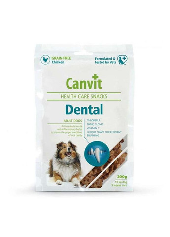 Canvit (канва) Dental Snack надають свіжості подиху в задоволення Вашому вихованцеві. Зубний камінь, наліт і гінгівіт - це поширені проблеми у собак, які призводять до кровотечі з ясен, болю і проблем з пережовуванням їжі і як результат - до втрати зубів. Ефективним способом догляду за зубами є попередження формування зубного нальоту. Компоненти, в складі ласощів Canvit Dental: хлорелла, гвоздика, омега-3 ненасичені кислоти, колаген і гексаметофосфат ефективно борються з формуванням зубного нальоту, і так само мають антисептичні та протизапальні властивості, забезпечуючи здоров'я ясен і ротової порожнини. Показання: Для видалення і профілактики формування зубного нальоту, розвитку гінгівіту. Для свіжості дихання. Склад: картопля, курка (15 %), рідкий крохмаль, жир з оселедця (5 %), гідролізований куряча печінка, колаген, хлорелла (5 г / кг), гексаметафосфат натрію (2 г / кг), гвоздика (1 г / кг). Гарантований аналіз:протеїн 16,0 %, жир 7,5 %, вологість 17,0 %, зола 3,5 %, клітковина 1,5 % 10 шматочків для собаки вагою 10 кг містять: хлорелла 50 мг, гексаметафосфат натрію 20 мг, гвоздика 10 мг, Омега-3 (EPA, DHA) 200 мг Харчові добавки в 1 кг: вітамін C (E301) 600 мг. Інструкція по застосуванню: ласощі дають прямо з руки або додають в корм. Рекомендовані норми годування: Вага собаки Кількість шматочків в день 1 кг 2 шт 5 кг 5 шт 10 кг 10 шт 20 кг 15 шт 30 кг 20 шт 40 < кг 25 < шт В упаковці: 250 шматочків, на 25 днів застосування для собаки вагою 10 кг