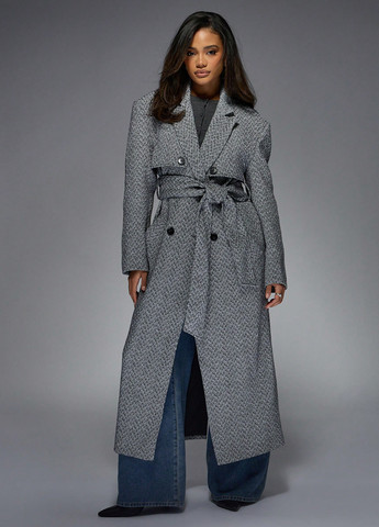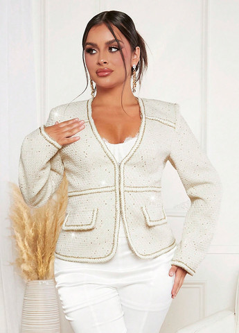 Це бежевий жакет із твіду має глибокий V-подібний виріз, довгі рукави зі звичайними манжетами та однобортну планку. Передній клапан має контрастне оздоблення і прикрашений контрастною палітуркою. Стиль ідеально підходить для вечірок пізньої осені, з рівномірною посадкою по тілу і більш плоским силуетом, що підходить для повсякденного носіння.