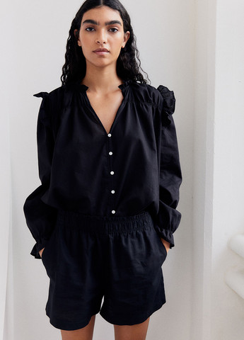 Штани з візерункової віскози. Невимушений крій із застібкою на талії, блискавкою з ґудзиком і еластичною резинкою на спині. Фальшива прорізна кишеня ззаду та прямі штанини. Внутрішня сторона гомілки: довжина: 79,0 см (розмір 40), стегна: обхват: 106,0 см (розмір 40)