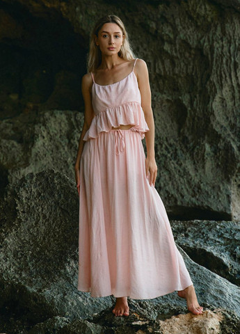 Костюм із топа з оборками та спідниці максі - ідеальна база для розслаблених літніх образів. Виконаний із жатки на натуральній бавовняній підкладці, має приємну до тіла фактуру вуалі. Топ на тонких бретелях, довжину яких можна регулювати. Спідниця на еластичній тонкій резинці на зав'язці.