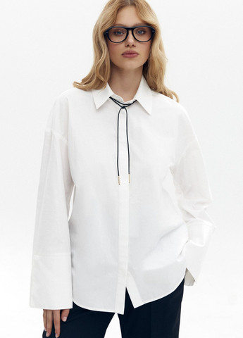 Сорочка вільного прямого крою зі 100% бавовни. Модель стилізована відкладним коміром і злегка закругленим подолом. Прямий довгий рукав із розрізами на манжетах.