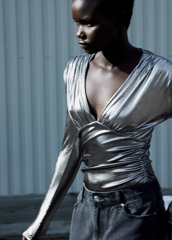 Строгий блейзер з відкритої тканини з гострими лацканами, окантовкою на кишенях, підплічниками та рукавами 3/4 довжини. На підкладці. Рукав: довжина: 53,0 см (розмір 40), Плечі: ширина: 42,0 см (розмір 40), Спинка: довжина: 66,5 см (розмір 40).