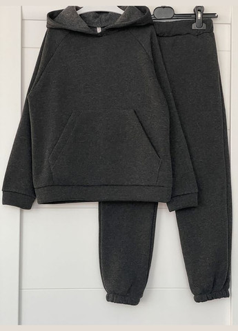 Теплий спортивний костюм із трикотажу тринитки з начосом. Костюм універсального графітового кольору підійде і хлопчикам, і дівчаткам. Модель дуже зручна. Штани досить вільного крою, з комфортною резинкою в поясі. Кофта-худі дуже зручна для прохолодної погоди, з капюшоном та кишенею кенгуру.