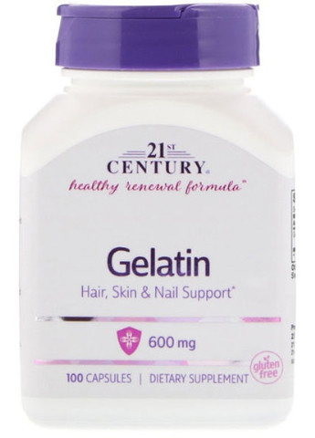 Формула для здорового відновлення Позитивно впливає на стан волосся, шкіри та нігтів Біологічно активна добавка Не містить глютену Желатин підтримує здоров'я волосся, шкіри, нігтів і хрящової тканини. Желатин від 21st Century - фармацевтичний желатин найвищої якості. Рекомендації щодо застосування: В якості біологічно активної добавки дорослим приймати по одній (1) капсулі під час їжі три (3) рази на день або відповідно до рекомендацій лікаря. Не слід перевищувати рекомендовану дозу. Результати залежать від індивідуальних особливостей. Інші інгредієнти: Стеарат магнію.Не містить доданого цукру, солі, дріжджів, консервантів або штучних ароматизаторів. Попередження: Проконсультуйтеся з лікарем перед застосуванням даного продукту в разі вагітності, годування грудьми, прийому будь-яких ліків, наявності будь-якого захворювання або при підготовці до медичної операції. При виникненні побічних ефектів припиніть прийом препарату і зверніться до лікаря.Зберігати в місці, недоступному для дітей. Не застосовувати препарат, якщо на упаковці присутні сліди розтину або її герметичність порушена. Зберігати при кімнатній температурі.