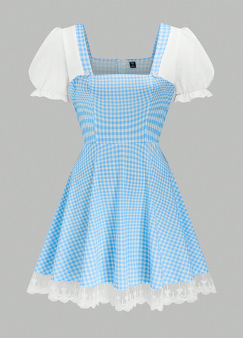 Елегантна сукня-міді з квадратним вирізом. Це сукня А-силуету з квадратним вирізом та високою талією. Воно включає контрастну мереживну талію і рукави-ліхтарики. Сукня має стандартний крій та розкльошений поділ. Використовується нееластична тканина. Деталі включають оборки та застібку-блискавку.