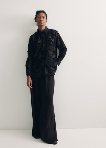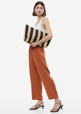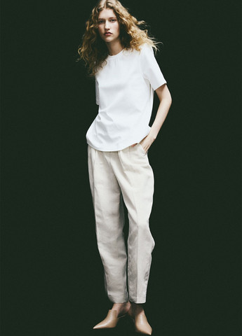 Штани довжиною до щиколотки із суміші льону та віскози. Висока талія, подовжений пояс на потайному гудзику та застібці на гачки, ширинка на блискавці та еластична талія ззаду. Складки зверху, діагональні кишені спереду, несправжні кишені з прорізом ззаду. Звужені штанини зі складками спереду та ззаду. Можливе пошкодження бірки.