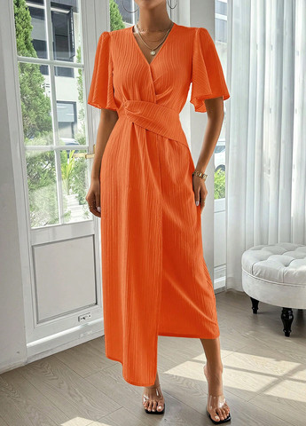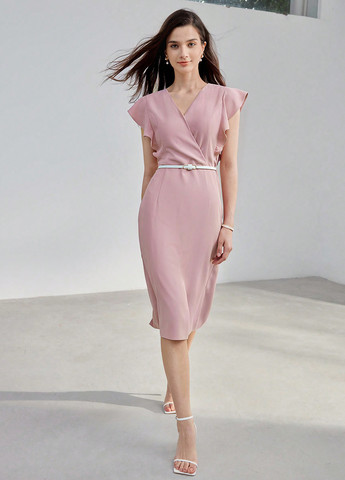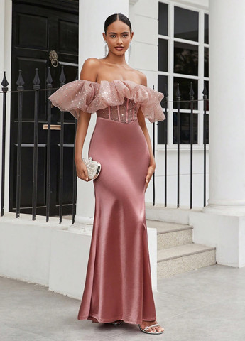 Ця вечірня сукня А-силуету має завищену талію, низ у формі русалки та виріз із відкритими плечима. Виготовлена з атласу середньої еластичності, має короткий рукав-буф та дизайн без спинки. Сукня прикрашена воланом і застібається на блискавку. Ця приталена максі-сукня, доступна в рожевому кольорі, ідеально підходить для офіційних заходів.