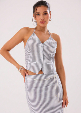 Літній жилет-топ MUSERA у тонку смужку з лямкою на шиї – сексуальний топ із відкритою спиною, асиметричним вирізом та подолом. Модель має приталений крій та стандартну довжину, виготовлений з бавовняної тканини.