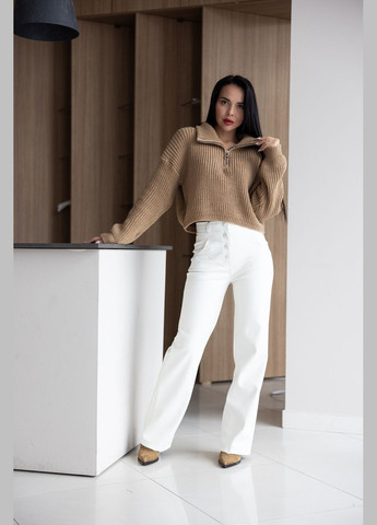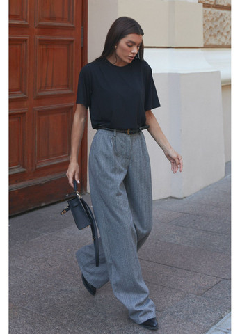 Брюки прямого, вільного крою з високою посадкою. Попереду виконані декоративні складки, що формують легкий об’єм і підкреслюють сучасний силует. Пояс комбінований: спереду класична застібка на блискавку та гудзик, а ззаду — зручна еластична резинка для комфортної посадки. Передбачені функціональні кишені, що роблять модель практичною. Оптимальні для демісезонного періоду.