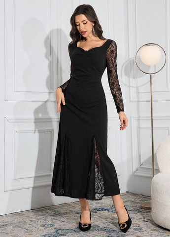 Елегантна жіноча плісована сукня SHEIN Privé з розрізом. Ця сукня має виріз у формі серця та стандартний дизайн рукавів. Виріб має стандартний крій та природну лінію талії. Вона включає деталь з поворотом. Тканина не тягнеться.