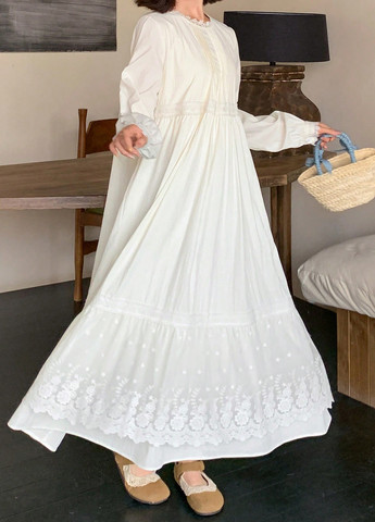 Жіноча біла вільна сукня «Фея» від FRIFUL з круглим вирізом та довгими рукавами. Висока талія та волан по низу. Сукня виготовлена з тканини, що складається на 71% із поліестеру та на 29% із поліаміду. Сукня підходить для урочистих та вечірніх заходів.
