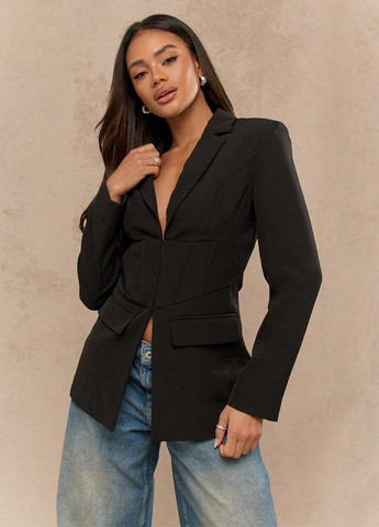 Цей подовжений блэйзер MISSGUIDED Tailored Corset Waist Detail має вишуканий силует. Він має облягаючий крій та корсетну талію. Жакет застібається на гачки. У нього звичайні рукави та звичайна форма подола. Жакет виготовлений із нееластичної тканини.