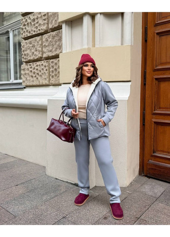 Теплий костюм (кофта, штани). Кофта з капюшоном на хутрі. Застібається на блискавку, дві прорізні кишені з боків. Штани на резинці із високою посадкою. Довжина кофти на розмір 48-50: 70 см, довжина рукава: 62 см, обхват грудей: 110 см. Штани: довжина виробу-112 см, внутрішнього шва-86 см, обхват стегон: 114 см. Довжина кофти на розмір 52-54: 70 см, довжина рукава: 62 см, обхват грудей: 118 см. Штани: довжина виробу-112 см, внутрішнього шва-86 см, обхват стегон: 120 см. Довжина кофти на розмір 56-58: 70 см, довжина рукава: 62 см, обхват грудей: 126 см. Штани: довжина виробу-112 см, внутрішнього шва-86 см, обхват стегон: 126 см.