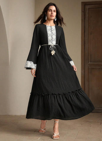 Сукня міді Anewsta Elegant Festival. Це сукня міді з круглим вирізом та довгими рукавами. Висока талія та А-силует. Доповнюється поясом та оборкою. Підходить для повсякденного носіння.