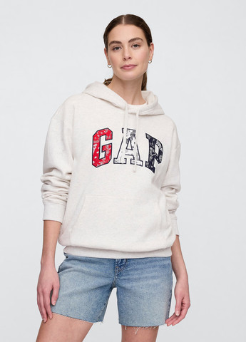 Стильне худі GAP. М'яке і приємне до тіла худі з каптуром на зав'язках і великим нашитим логотипом спереду. Логотип виконаний з матеріалу, що імітує тканину та принт бандани. Усередині утеплено флісом. Манжети рукавів та низ у рубчик. Спереду велику кишеню-кенгуру. Відмінна якість.