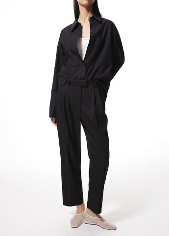 Штани довжиною до щиколотки з високою талією з тканого матеріалу, з гумкою ззаду на поясі, складками та широкими, злегка звуженими брючками із запресованими складками. Застібка-блискавка та потайний гачок спереду. Бічні кишені та несправжні задні кишені.