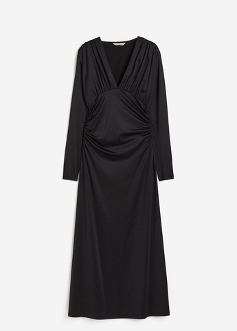 Сукня, що облягає фігуру, довжиною до щиколотки з м'якого еластичного трикотажу з тонким блиском. Модель з глибоким V-подібним вирізом, довгими рукавами та злегка розкльошеною спідницею. Призбірені шви на плечах, під грудьми та збоку на талії створюють ефект драпірування.
