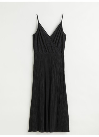 Коротке плаття з плетеної тканини з легким блиском. Вони мають комір і глибокий виріз із потайною застібкою на гачок спереду. Еластичний шов ззаду на талії та закручена деталь спереду, яка створює ефект плісе. Довгі рукави оброблені широким манжетом з розрізом і ґудзиком. Пошита спідниця з обхвату. Без підкладки.