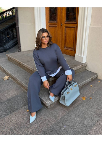 Перед замовленням ознайомтесь із замірами: 🔸 Розміри: 50–52 / 54–56 / 58–62 🔸 Тканина: якісна двонитка (не кошлатиться і не линяє) + супер софт 🔸 Кольори: чорний, темно-синій, графіт 🔹 Кофта: ОГ — 122 / 134 / 146 см Довжина рукава — 63 / 64 / 65 см Загальна довжина — 68 / 71 / 74 см 🔹 Штани: ОТ — 100–110 / 108–118 / 116–126 см (резинка, добре тягнеться) ОС — 122 / 136 / 147 см Довжина зовнішнього шва — 108 / 109 / 110 см Довжина внутрішнього шва — 73 / 74 / 75 см 💫 Прогулянковий костюм, який закохує з першого погляду! Кофта оригінального крою — трикотаж з білим супер софтом на рукавах і низу, створює ефект сорочки. Штани палаццо середньої посадки з кишенями та зручною резинкою. Біла стрічка на рукавах і штанах додає виробу яскравості та стильного вигляду. Костюм можна носити як комплект або окремо — чудово комбінується з іншим одягом. Тканина приємна до тіла, має гарну розтяжність та зносостійкість ✔️