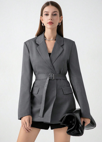 Елегантний жакет з довгим рукавом темно-сірого кольору має глибокий сірий колір та дизайн з довгим рукавом. Він має стандартний крій, включає пояс і помилкові кишені. Він має стандартний тип рукава та стандартну форму подола. Тканина не тягнеться.