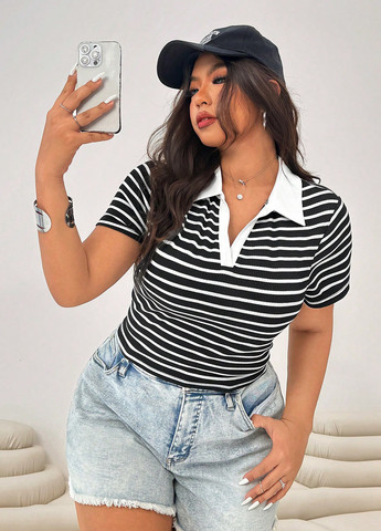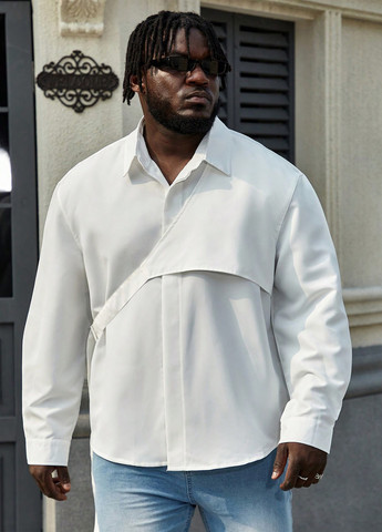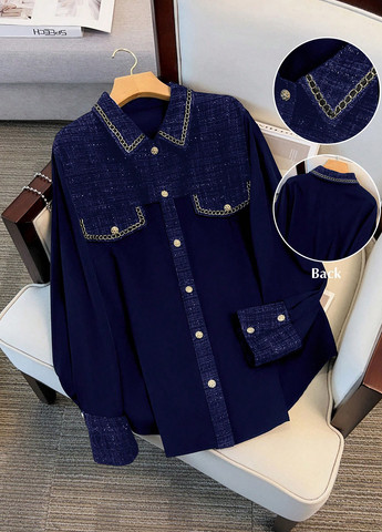 Елегантна блуза SHEIN LUNE великих розмірів в офісному стилі. Ця блузка з коміром та рукавами стандартної довжини. Асиметричний поділ та застібка на гудзики. Блуза темно-синього кольору, класичного крою. Тканина – суміш поліестеру та еластану. Машинне прання або професійне хімчистка.
