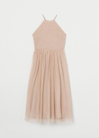 Сукня завдовжки до литок, з серпанку і шифону, з ліфом, розшитим бісером, і вузьким кроєм зверху. Регульовані вузькі бретелі перехрещуються ззаду, збоку потайна блискавка, спина відкрита. Відрізна талія і м'яко струмлива спідниця кльош. На підкладці. Можливо пошкодження бірки.