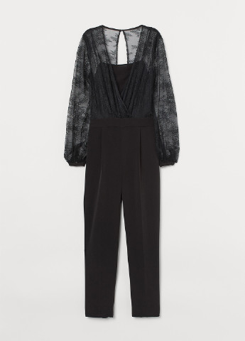 Скорочений комбінезон з нижньою частиною з тканого матеріалу і верхньою частиною з мережива. Глибокий трикутний виріз спереду з пришитим запахом і розріз уздовж спинки з потайною ґудзиком у горловини. Довгі рукава з вузькими манжетами на обтягнутою гудзика. Підкладка у вигляді відстібається майки з тканого матеріалу з трикутним вирізом і вузькими регульованими бретелями. Відрізна талія з закладеними складками і скошені бічні кишені. Завужені донизу штанини з загладжені стрілками. Потайна блискавка, а також застібка на гачки ззаду на талії. Можливо пошкодження бірки.